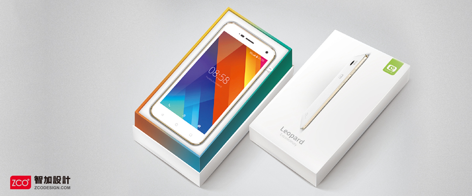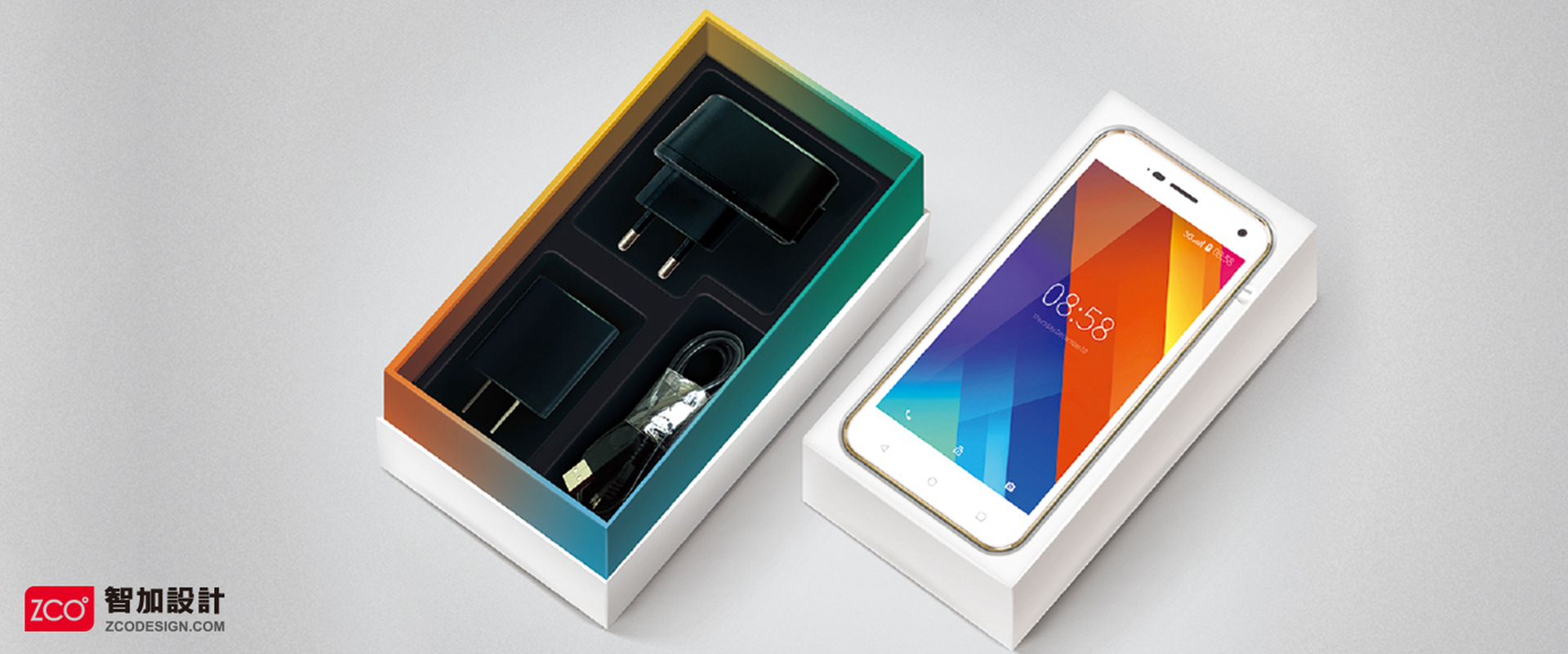 本方案以簡潔大方的形式設計,主色調以白色為主,分上下蓋,兩蓋接口處留10mm寬露出里層漸變色包裝,極具年輕時尚感。內托分為上下兩層,上層放置手機,下層放置配件,手機托架在配件拖上面,既節省空間又方便美觀。