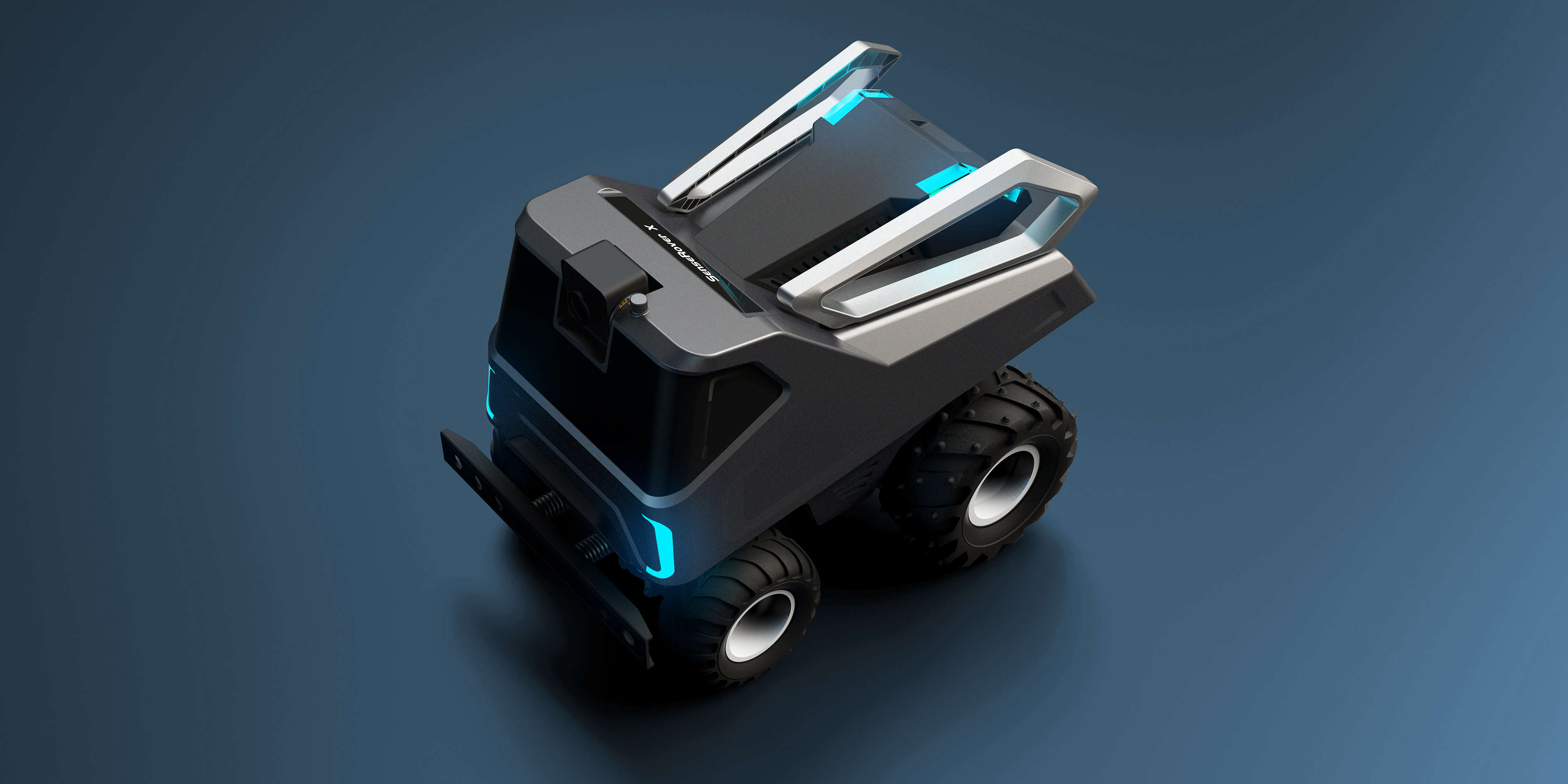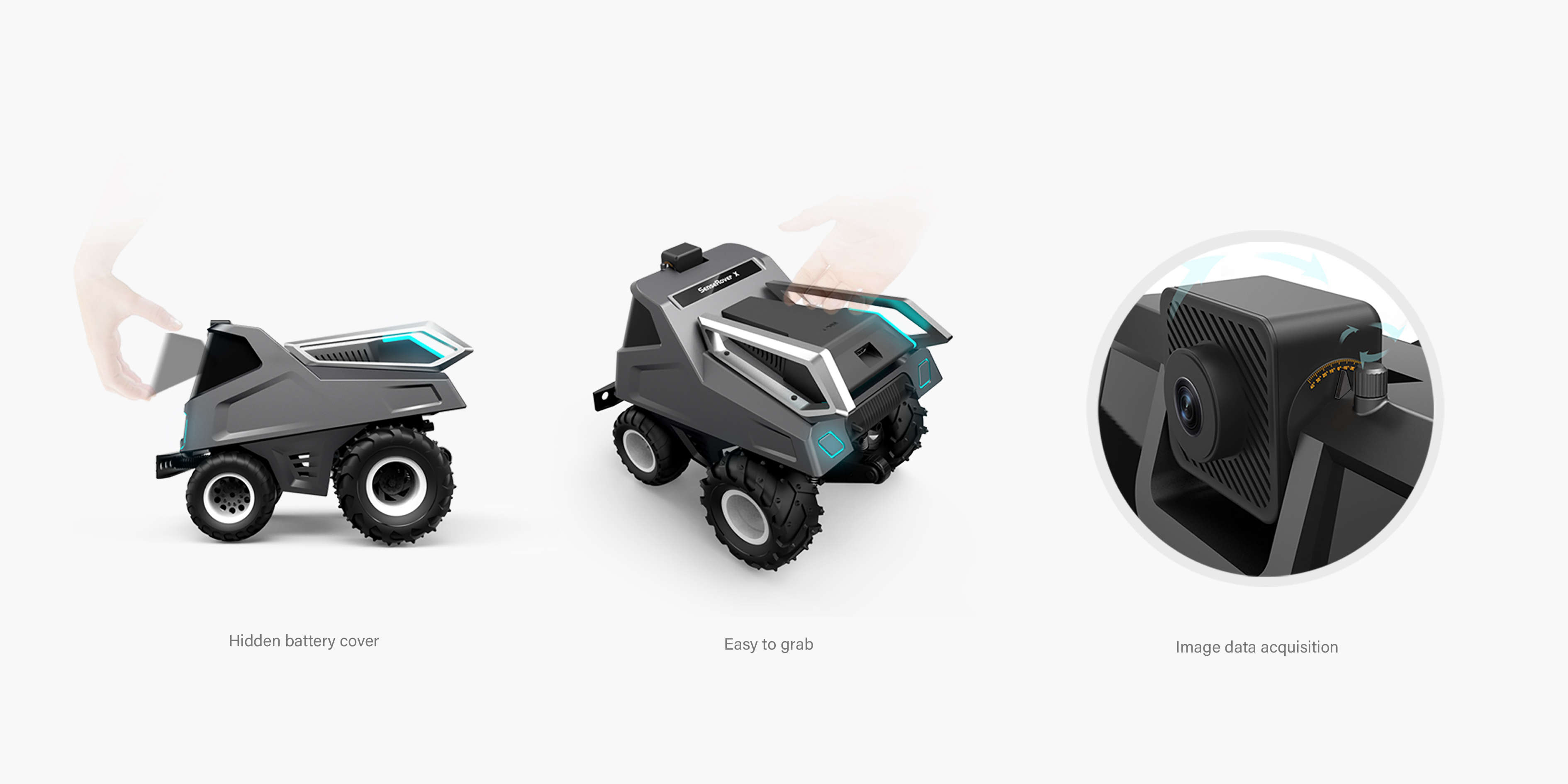 在外觀造型上以科技+輕盈為主題采用仿生設計手法,以“蟬”為基礎形態。車體前臉的大面積視窗主要功能方便電池的取出而又不失科技感。背部兩翼金屬支架模擬蟬的翅膀,主要功能是方便車體被拾??;槍灰色的金屬質感與燈光的運用其目的也是為了突出該產品的未來感。