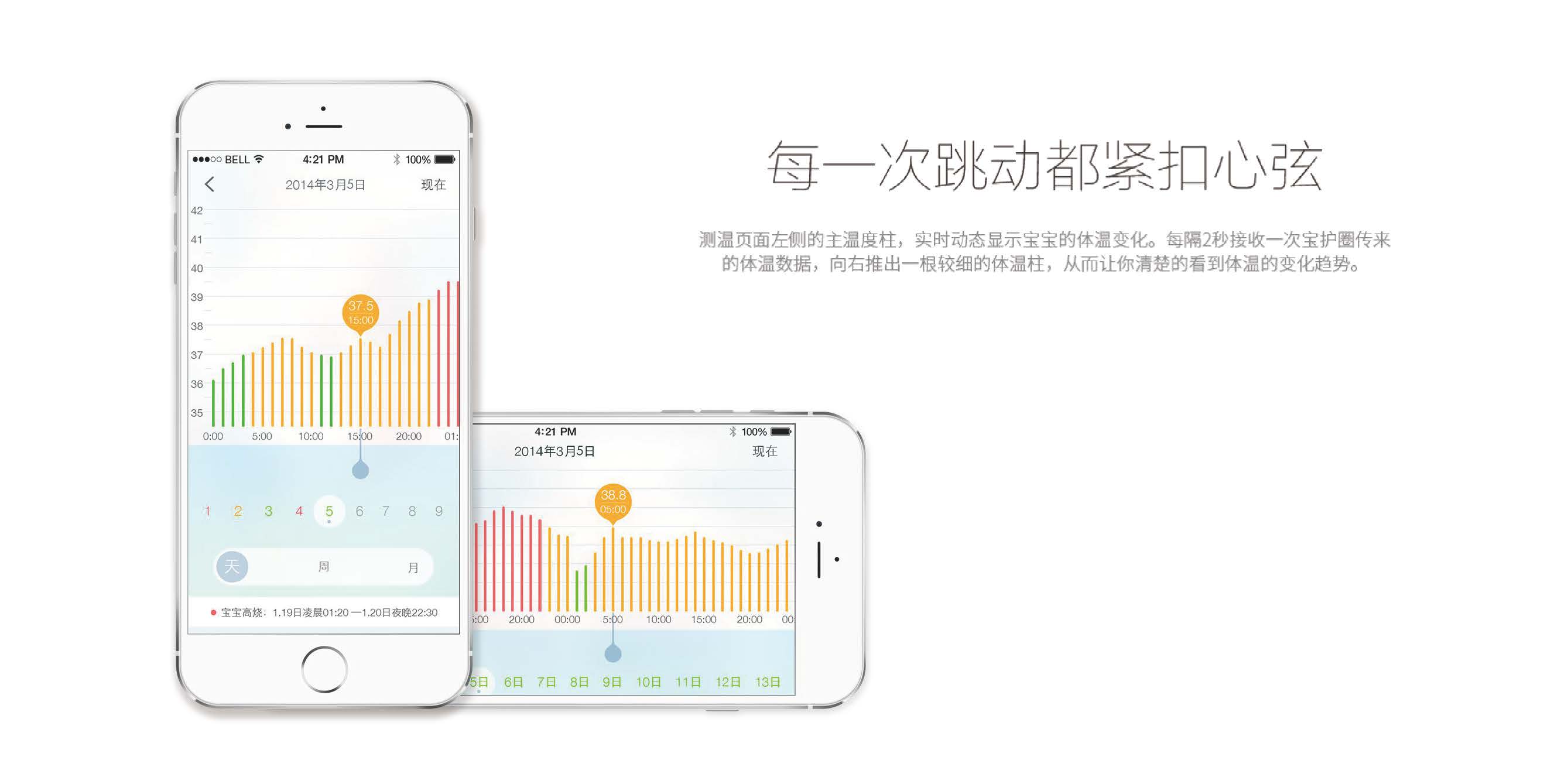 “寶護圈”整體設計親切溫和,最優美的線條也是最溫潤亮澤的形態,柔韌體貼的護圈設計,超乎想象的柔軟質感,順滑細微,呵護寶寶的嬌嫩肌膚。同時可連接APP,登錄統一賬號,即使遠在異國他鄉,也能即使獲知寶寶體溫變化情況,為愛而生,讓寶寶得到更好的呵護,媽媽更安心。